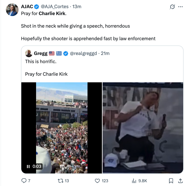 Charlie Kirk, a legend in truth telling and fighting evil, has been shot while giving a speech at Utah Valley University (UVU) in Provo Utah. It looks as though he was shot in the neck… still waiting details.