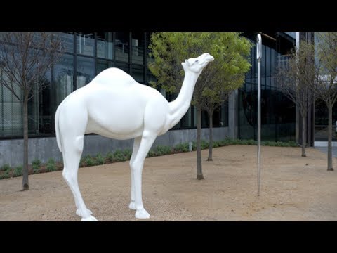 The sculpture, titled “Camel Contemplating Needle” depicts a life-size white camel staring into the eye of an oversized needle.